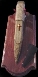 Una estaca contra vampiros mundana, marcada con un símbolo religioso para aumentar su efectividad