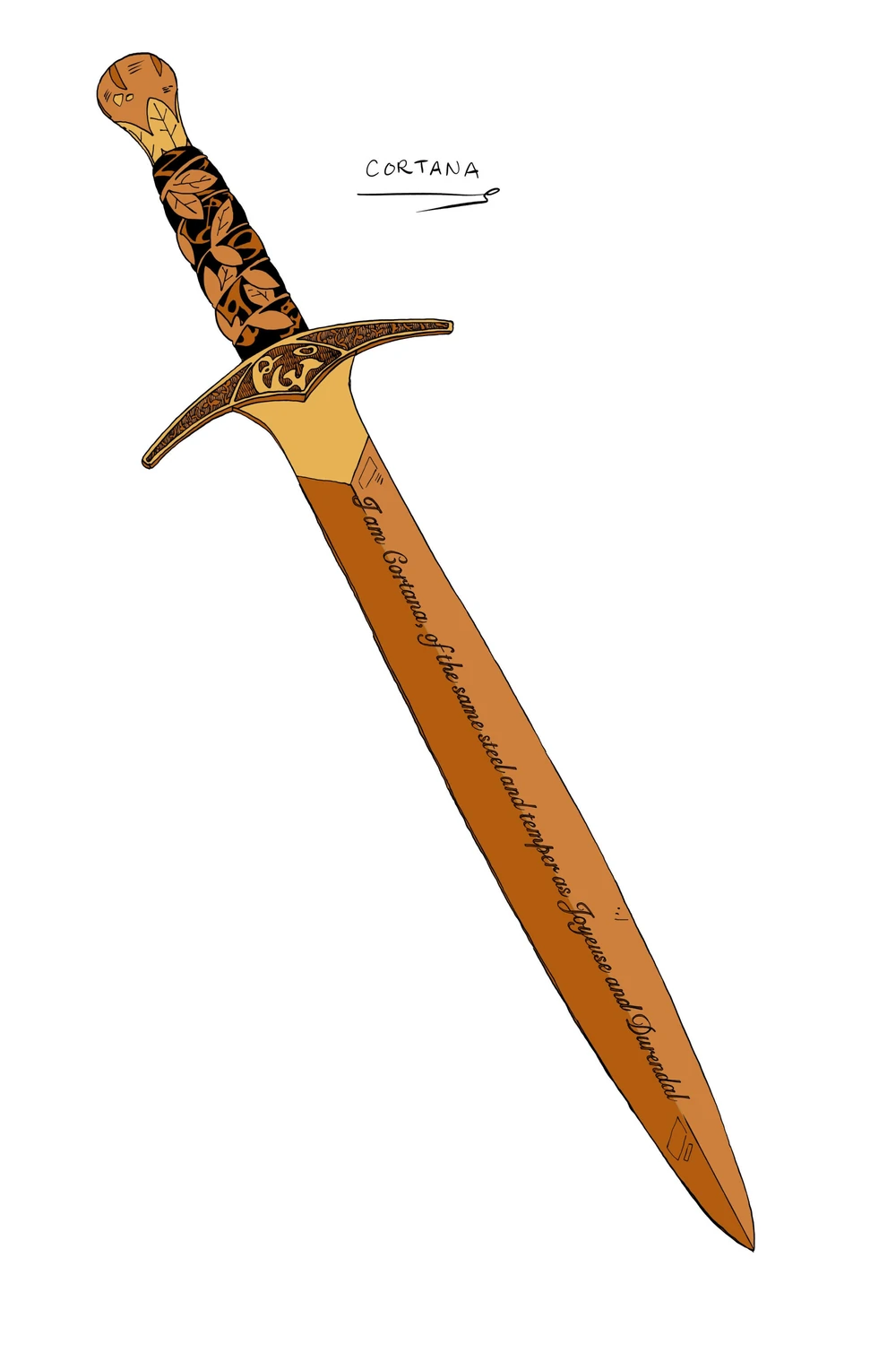 Кортана - короткий меч с простым и голым клинком кроме надписи, которая выгравирована вдоль поверхности клинка и описывает процесс его легендарной ковки, "той же стали и закалки, что Жуайёз и Дюрандаль". В его рукоятке по-видимому есть перо от крыла архангела Михаила.[1]